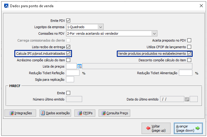 Configurações específicas na empresa do Ponto de Venda, menu PDV 1.2-A, botão [Ponto de venda], marcar os campos "Calcula IPI p/prod.industrializados" e "Vende produtos produzidos no estabelecimento".