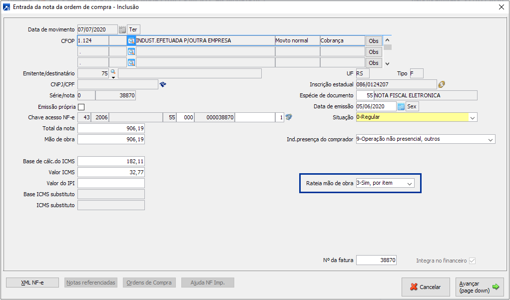 Depois de informar a nota de retorno simbólico para vincular a mão de obra e avançar, será exibida esta nova tela de rateio.