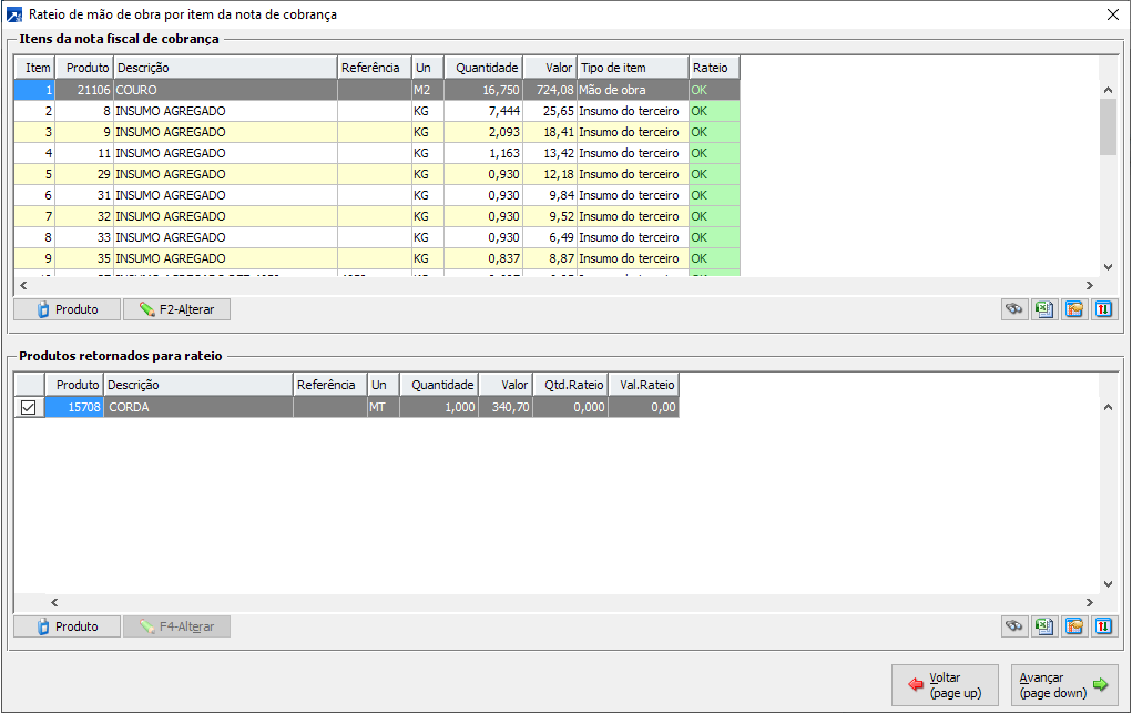 Os dados na parte superior, são o produto pronto (mão de obra) informado na nota e os insumos aplicados que irão ser rateados no custo.