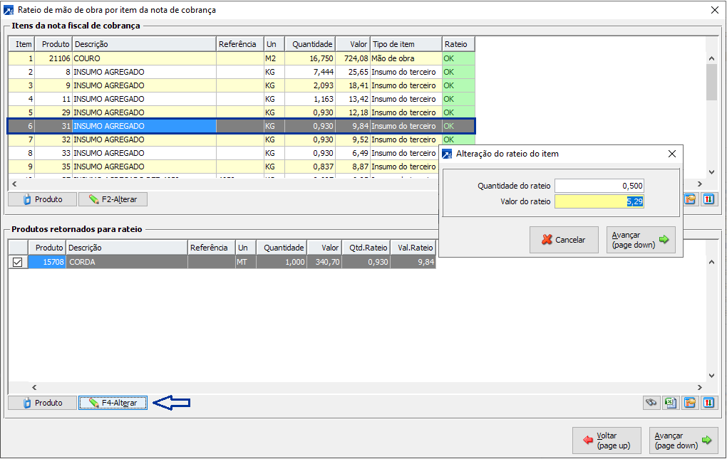 É necessário selecionar o insumo a ser rateado e posteriormente clicar em "F4-Alterar" na parte inferior da janela (quadrante do produto pronto) para indicar a quantidade equivalente deste insumo para aquele produto pronto.