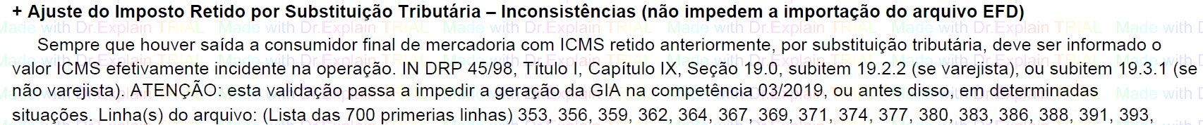 1-Ao validar o arquivo SPED Fiscal na GIA9, e as vendas efetuadas para consumidor final não tiverem a informação do ICMS efetivo, a GIA9 não será validada, exibindo a seguinte mensagem: