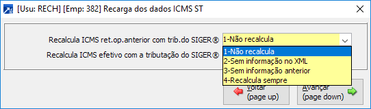 1-Não recalcula: Esta opção não vai recalcular os valores de ICMS retido anteriormente, utilizando as alíquotas definidas no cadastro do produto ou da empresa, mesmo quando não tiver as informações no XML das NFes.