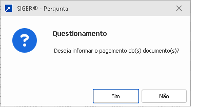 Após confirmar a inclusão dos valores de descontos, multas ou juros ainda é possível efetuar o pagamento do vencimento, para isso é aberta uma janela questionado se deseja ou não informar o pagamento. Caso opte por pagar o desdobramento/parcela, serão acessadas as mesmas janelas da rotina normal de pagamento acessadas pelo botão [Pagamento].