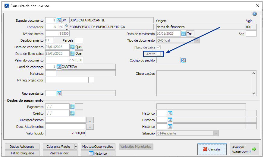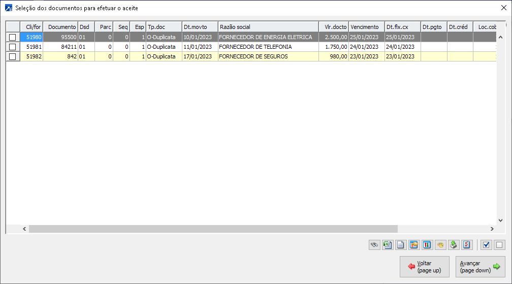 F3-Diversos documentos: Nesse atalho será carregado a "Seleção padrão - Documentos do financeiro", possibilitando realizar o aceite em múltiplos documentos. Será exibida a janela "Seleção dos documentos para efetuar o aceite".