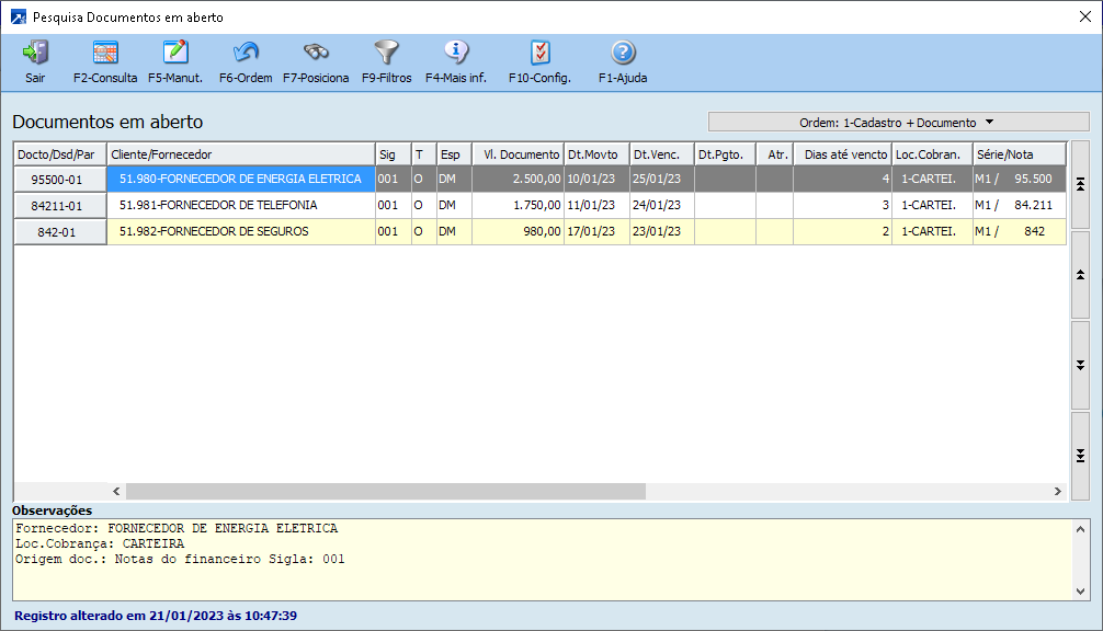 F9-Doctos: Esse atalho acessa a janela "Pesquisa Documento em aberto", possibilitando a seleção do documento.