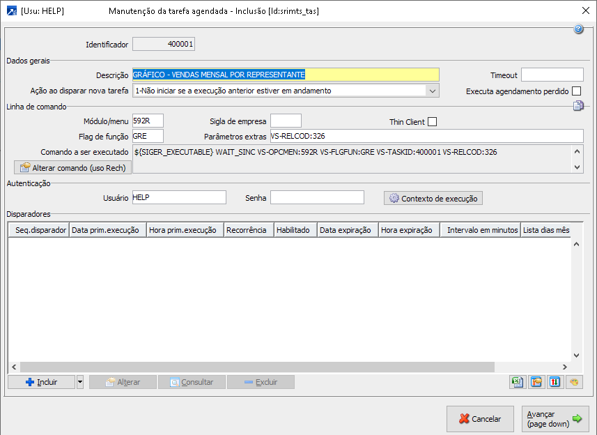 Quando o agendador é acessado diretamente por dentro de alguma rotina, vários dados necessário para rodar a tarefa já serão pré-carregados, como por exemplo, Descrição, Módulo/menu, parâmetros extras, entre outros.