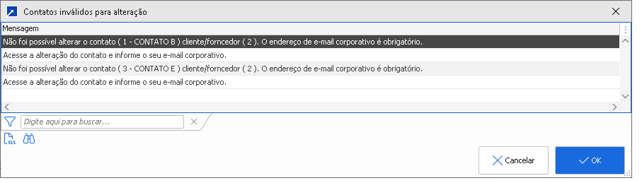 OBS: Para que a alteração ocorra como esperado, o contato deve possuir um e-mail corporativo cadastrado. Caso contrário, ao final da alteração geral, serão listados os contatos que não sofreram alteração devido à falta desse e-mail.