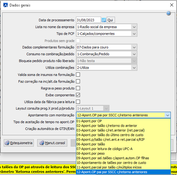 Existe uma categoria de apontamento que pode ser alterada de acordo com a configuração da empresa. Cada opção dessa configuração possibilita uma nova forma de fazer o retorno das ordens de produção (Apontamento/Reporte de produção) pelo GIN 2.3-T. O acesso se encontra em GIN 1.2-A, botão <Dados gerais>, campo "Apontamento com monitoração".