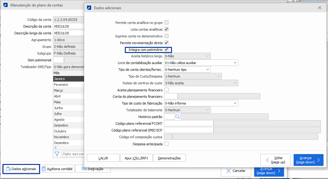 Alguma informações deverão ser configuradas para tal. A primeira dela é a conta contábil vinculada na CFOP de aquisição, que precisa estar configurada para integrar com o módulo patrimonial. A configuração é feita no botão [Dados adicionais], campo "Integra com patrimônio".