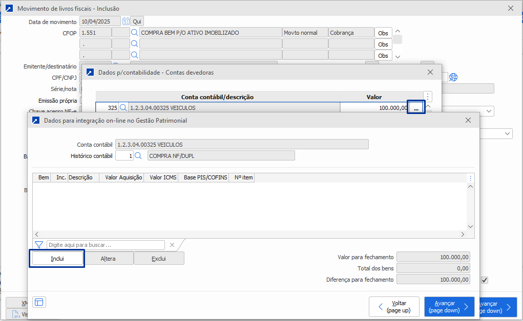 Na rotina de lançamento da nota de entrada de aquisição do bem, ao abrir a janela de "Dados para integração on-line no Gestão Patrimonial", clicar no botão [Inclui].