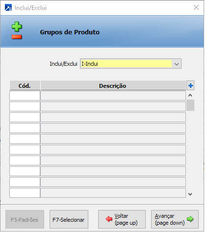 Seleciona (inclui/exclui) listas de grupo de produtos