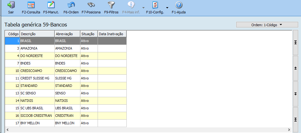 Selecionar o código do banco, conforme tabela Banco Central e Febraban, para pesquisar os bancos, tecla F8.