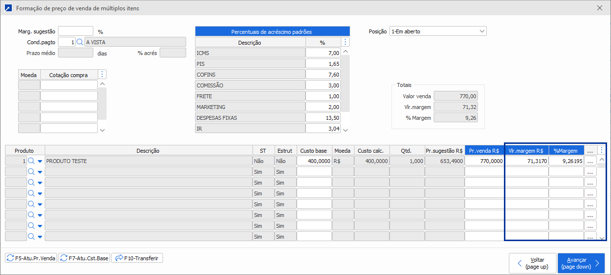Tipo de margem de referência que estará disponível na manutenção da formação do preço de venda de múltiplos produtos.