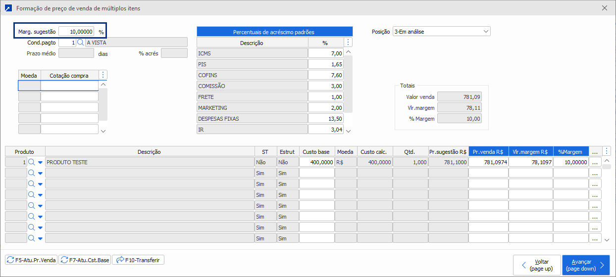Neste cenário, a margem de sugestão será aplicada igualmente para todos os itens do orçamento.