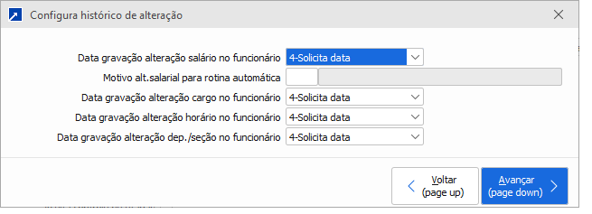 Janela onde é possível configurar a forma que será aceito a data de alteração dos históricos de Cargo, Salário, Horário e Departamento/Seção do funcionário.