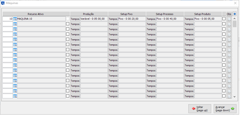 OBS: Na aceitação das máquinas poderão ser informados recursos ativos do tipo "Grupo de máquinas" e/ou "Linha de produção", nestes casos a rotina irá buscar os tempos de operação para cada máquina do grupo ou linha de produção.