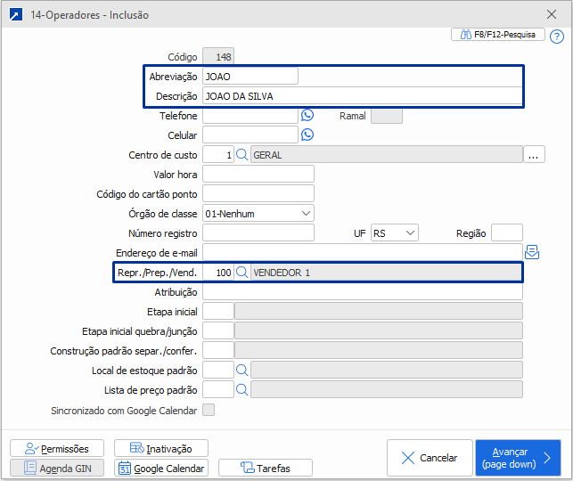 Na tela principal do cadastro de operadores, os principais campos a serem preenchidos para correta aplicação no módulo de telemarketing são os destacados abaixo: