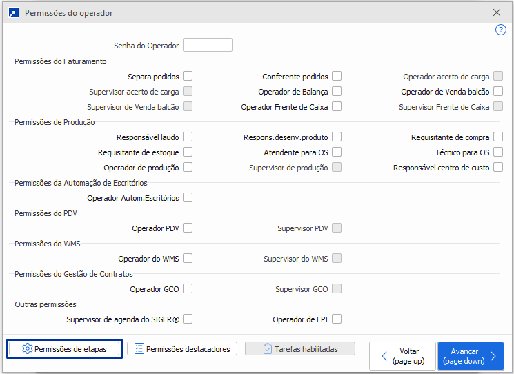 SIGER® vai abrir uma primeira tela de cadastro com uma série de permissões inerentes a outros módulos. Neste cenário, não é necessário informar nada.