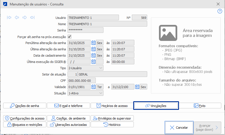 Uma vez dentro do cadastro de usuários, clique no botão <Vinculações>