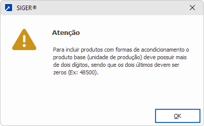 Se houver a tentativa de incluir um código que não termine em zeros, o SIGER® irá exibir um alerta, como o exibido abaixo: