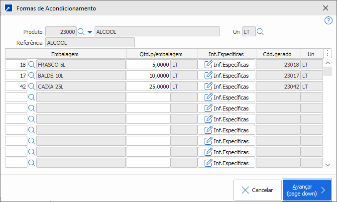 Na imagem abaixo podemos ver que foi indicado três acondicionamentos para o produto "23000-ALCOOL" (5, 10 e 25 litros) e também foi indicado a quantidade que será utilizada do produto base.