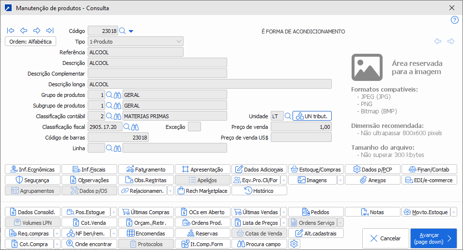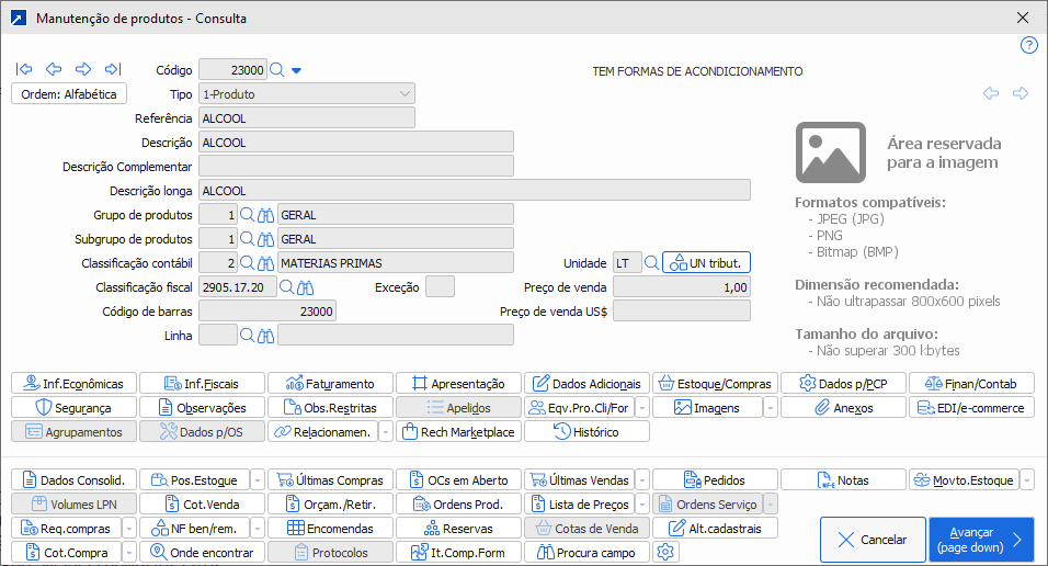 Há também a possibilidade de acessar o botão [Dados Específicos] e com isso será aberta a manutenção do produto forma de acondicionamento.