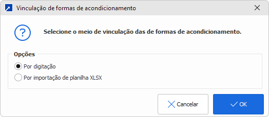 Ao acessar o menu, há a possibilidade de realizar a vinculação das formas de acondicionamento de duas formas: digitação ou planilha.