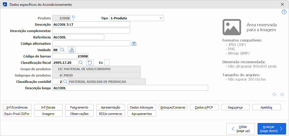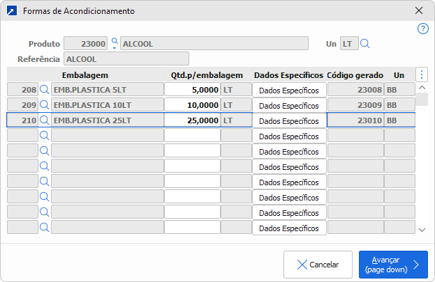 O cadastro do produto acondicionado também possui o código estruturado, eles possuem o mesmo código inicial do produto base, porém os dois zeros "00" finais do código são substituídos pelo código da embalagem que é utilizada.