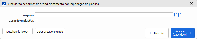 Importação de planilha: Esta opção permite ao usuário vincular as formas de acondicionamento através de uma planilha. Pode ser gerado um arquivo exemplo, que já tem as coluna prontas para preenchimento, e assim realizar a inclusão dos dados. É possível visualizar o layout através do botão [Detalhes do layout].