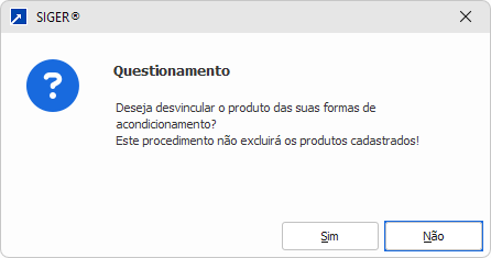 Desvinculação produto x embalagem de acondicionamento: No menu 1.6-U pode ser realizada a desvinculação da embalagem de acondicionamento do cadastro do produto base. Esse procedimento não exclui o produto acondicionado, apenas torna ele um produto independente do base.