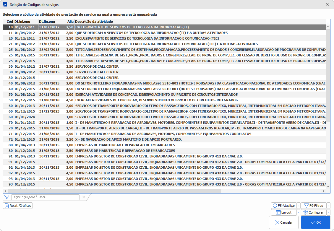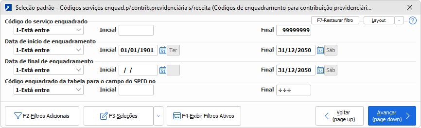 Para acessar a seleção dos códigos utilizar o atalho "F5-Seleção de códigos", ao selecionar o atalho será exibida a "Seleção padrão - Códigos serviços enquad.p/contrib.previdenciária s/receita".