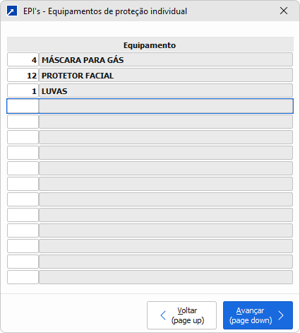 Lista de E.P.I. (Equipamento de Proteção Individual) necessários para manusear produto. Os mesmos podem ser cadastrados na tabela por empresa "19-Equipamentos de proteção" do módulo de Folha de Pagamento, ou utilizando a função "F8-Pesquisa", em seguida "F5-Cadastro".