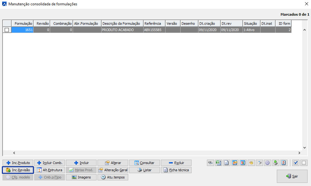 Na manutenção consolidada de formulações disponível no menu 1.7-M utilizar o botão [Inc.Revisão] conforme indicado abaixo.