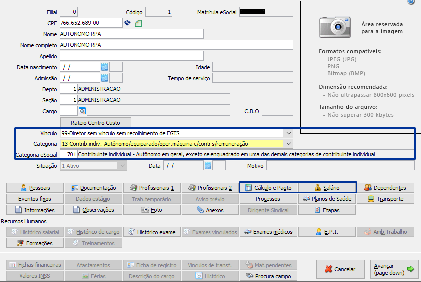 O cadastro do Autônomo é no MENU FPA 1.8-I, vínculo 99, categoria 13, categoria eSocial 701, e para calcular a RPA, MENU FPA 3.8-L, evento padrão do SIGER® para o pagamento é o evento 70-HONORÁRIOS e o desconto de INSS e IRRF, será calculado de forma automática, no botão [Cálculo e Pagto], manter desmarcada a check box "Calcula remuneração automática" e no botão [Salário] informar o valor de 0,01 .