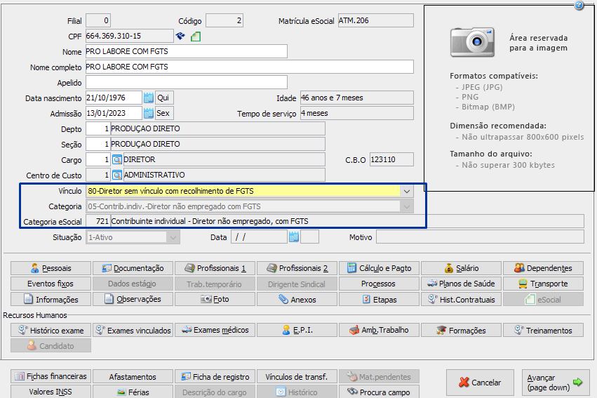 - PRO-LABORE COM recolhimento de FGTS, tem o vínculo 80, categoria 05 e categoria para eSocial 721.