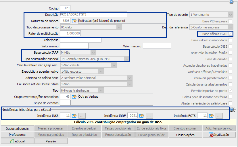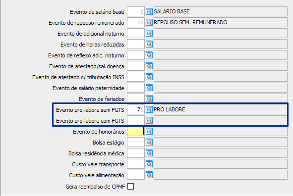 Exemplo do evento para calcular pro labore com FGTS MENU FPA 1.7-I.