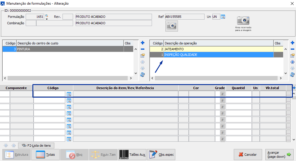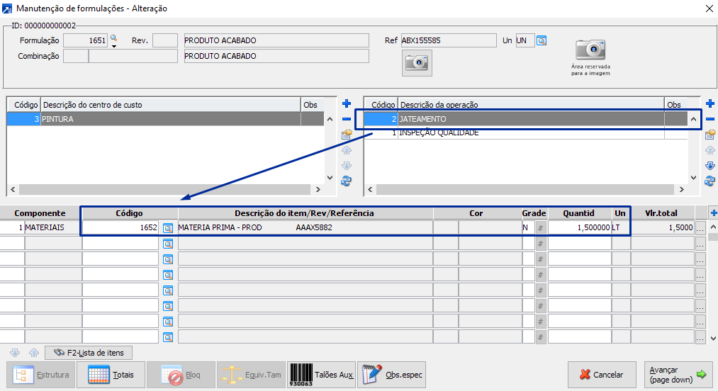 Exemplo: O insumo cod 1652 está vinculado a operação e jateamento.