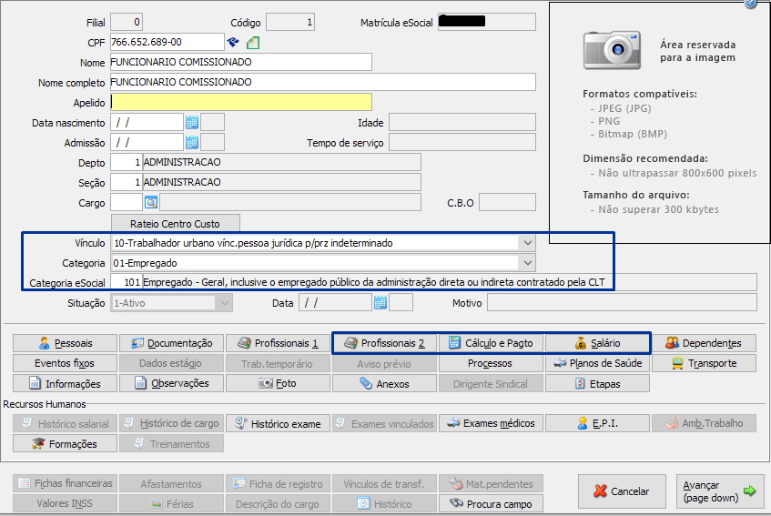 Cadastro Funcionário Comissionado