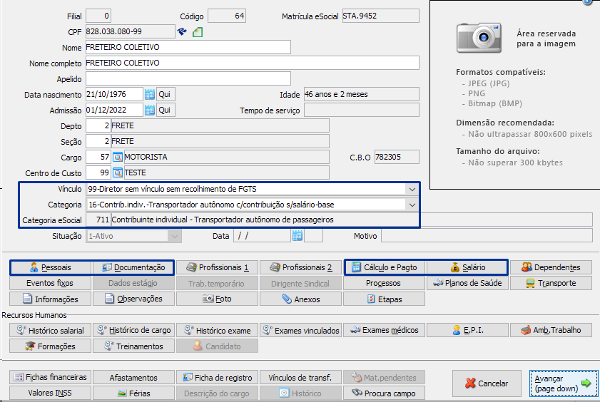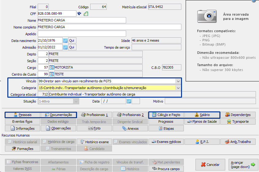 Ao cadastrar o AUTONOMO FRETEIRO, será necessário identificar se o frete é carga ou coletivo. Se for Freteiro de Carga será categoria 5 e se for Freteiro Coletivo será categoria 16. A categoria fará o SIGER® calcular corretamente o valor do IRRF, pois para a categoria 15 a base do IRRF é 10% do valor do frete e para categoria 16 a base de cálculo do IRRF será de 60% do valor do frete.