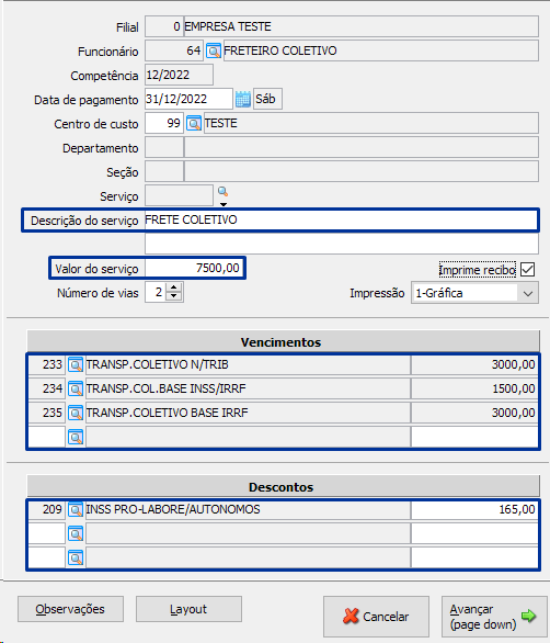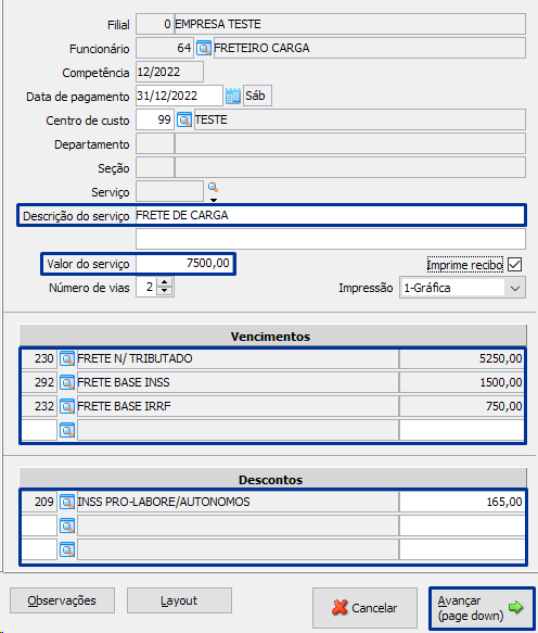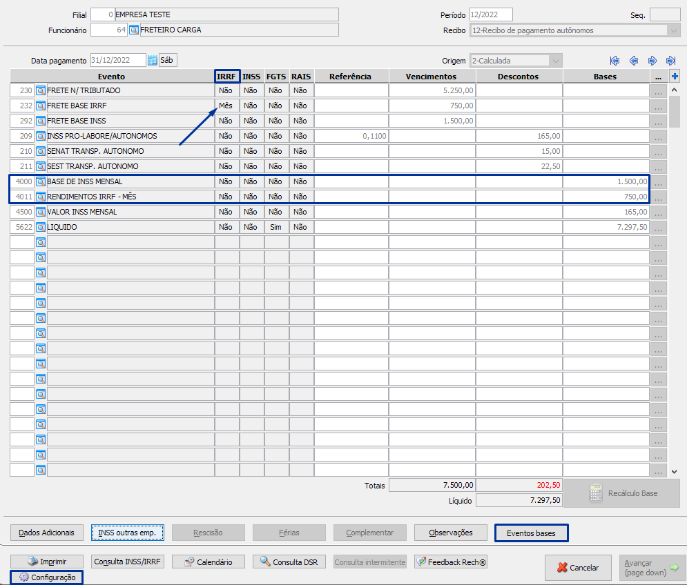 Exemplo: cálculo do RPA Freteiro Coletivo, categoria 16, FPA MENU 3.8-L, será demonstrando a base de calculo dos eventos 233, 234, 235 e o evento 209, lembrando que o IRRF será calculado ao avançar na janela. O Autônomo Freteiro prestou serviço como transportador Coletivo para a empresa X em dezembro/2022. O valor do serviço foi de R$ 7.500,00.