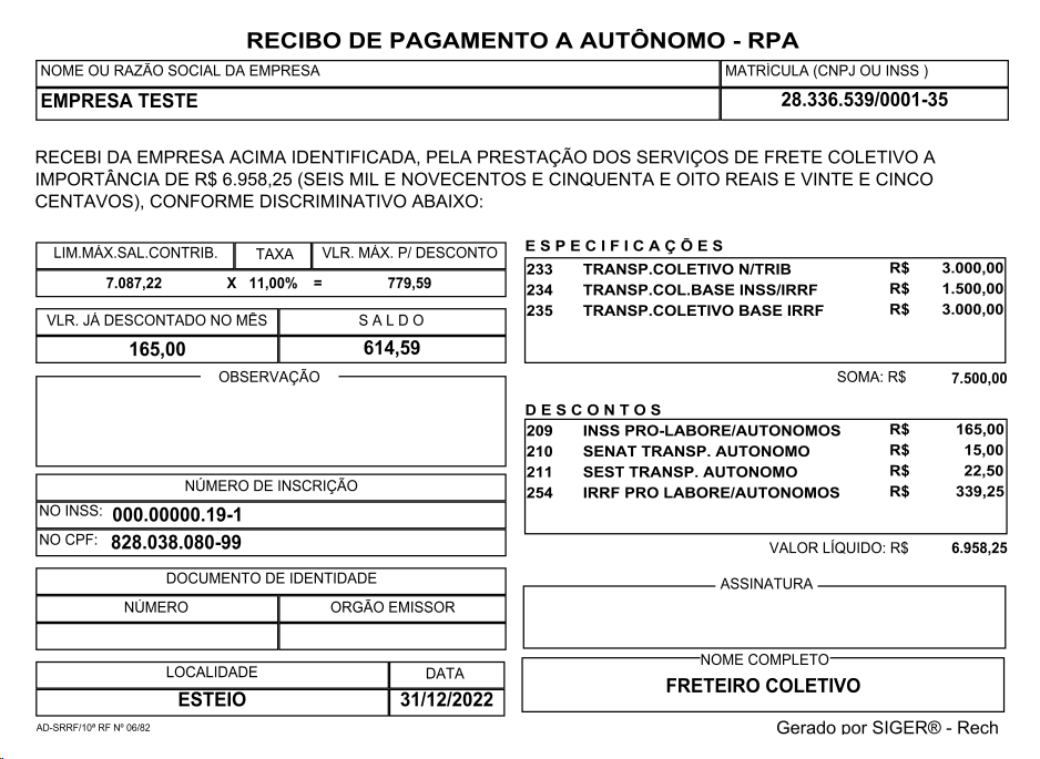 O autônomo Freteiro prestou serviço como transportador de cargas para a empresa X em dezembro/2022. O valor do serviço foi de R$ 7.500,00.