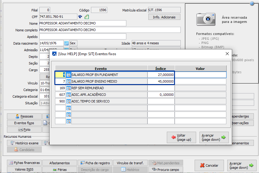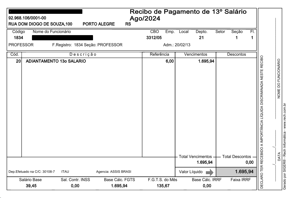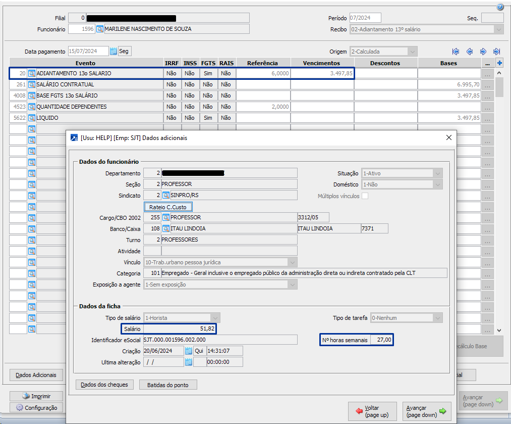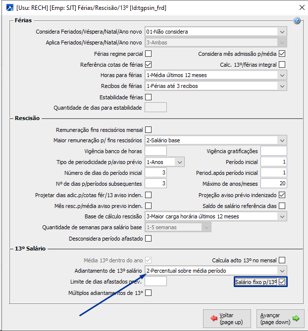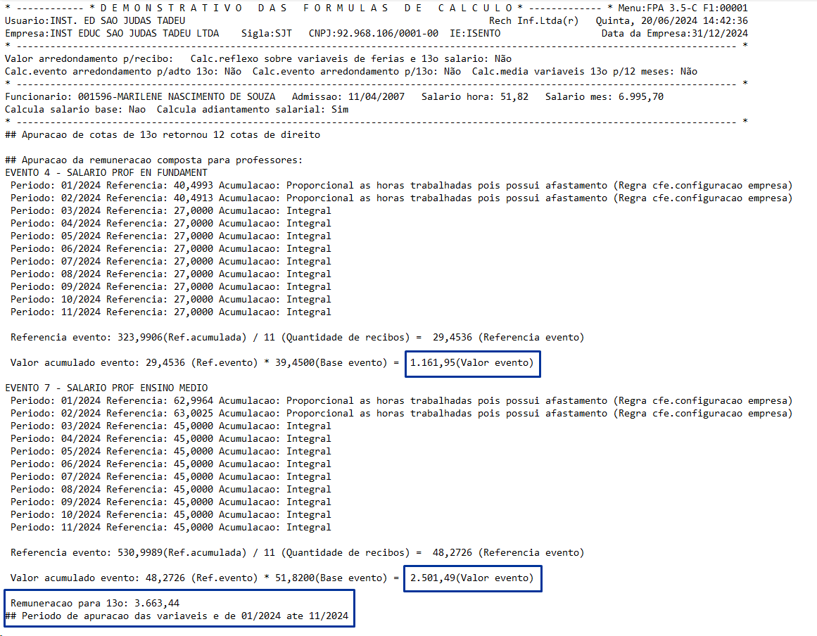 2 - professor esta configurado para calcular o adiantamento do 13º pela regra do SINDICATO MENU FPA 1.3-A tabela 04 botão [Férias/Resc./13º], aplica percentual sobre média período e a flag marcada "Salário fixo p/13º", SIGER® aplicará o percentual sobre período informado.