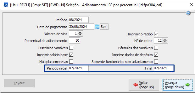 Neste exemplo o pagamento do adiantamento do 13º salário será na competência agosto, base de calculo sobre a remuneração de julho, MENU FPA 3.4-C.