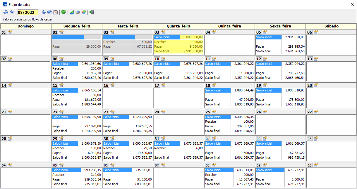 Os dias posteriores tem saldo inicial/final calculados de acordo com os movimentos a receber ou pagar no dia.