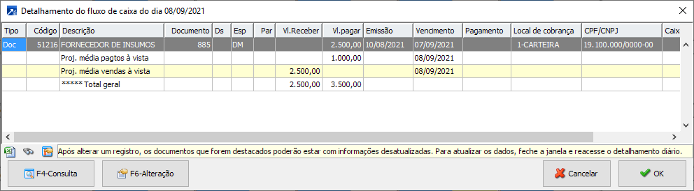 Nessa janela será possível acessar a consulta dos documentos e alterá-los, pelos respectivos botões <F4-Consulta> e <F6-Alteração>.