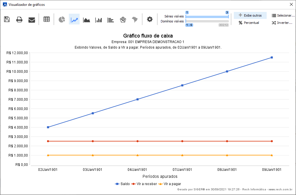 É possível retroceder ou avançar as datas com as funções F2-Ano anterior, F3-Mês anterior, F4-Próximo mês e F6-Próximo ano, gerar gráfico, impressão e identificação das cores de legenda.