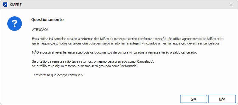 Os talões marcados na seleção terão a situação alterada para "5-Retornado", mesmo tendo saldo de quantidade a retornar. Isso permite que o processo de serviço externo seja finalizado para estes talões, e o saldo a retornar possa ser remetido através de outra remessa de serviço externo.