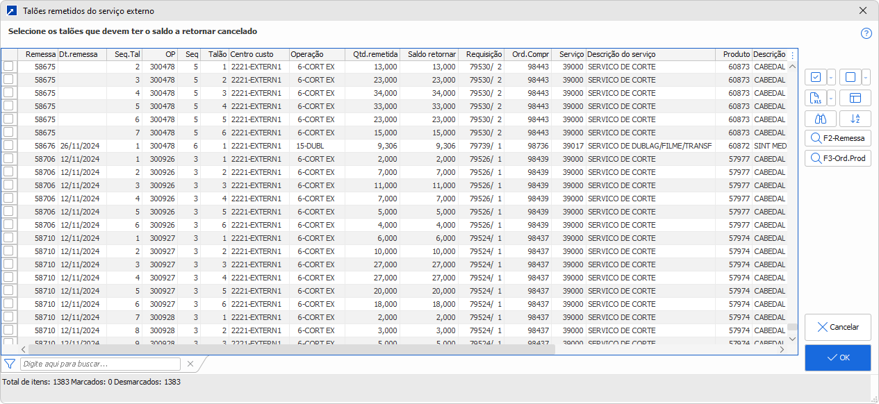 Após a confirmação, são processados os talões do serviço externo que estão com situação igual a "2-Comprado, 3-Remetido, 4-Parcialmente retornado", ou seja, que foram enviados ao serviço externo e ainda possuem quantidade a retornar. Os registros serão exibidos na seleção abaixo, permitindo marcar quais terão o saldo cancelado.