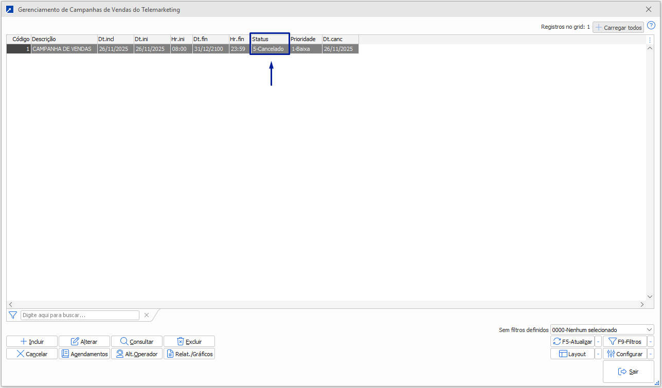 Porém, a mesma operação também pode ser feita através da manutenção consolidada de campanhas do telemarketing (menu 4.1-O) utilizando o botão <Cancelar>.