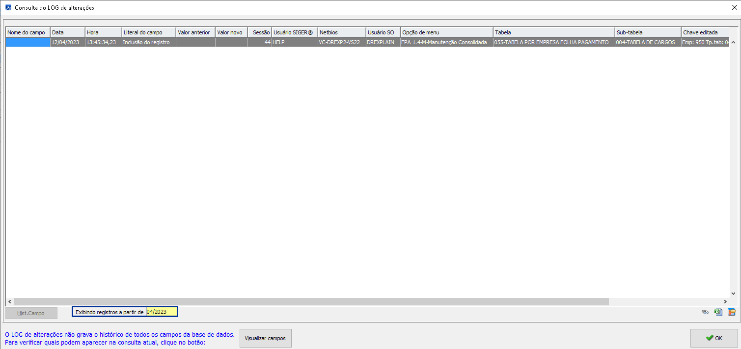 Ao acessar o menu na opção de consulta, habilita o botão histórico das alterações realizadas neste registro. Sendo possível informar uma competência inicial para visualizar as alterações.